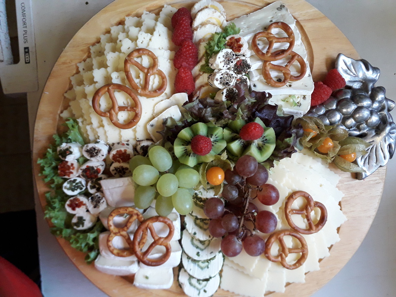 Käsebrett , fruchtiger Obstsalat und süße Quarkspeise