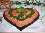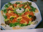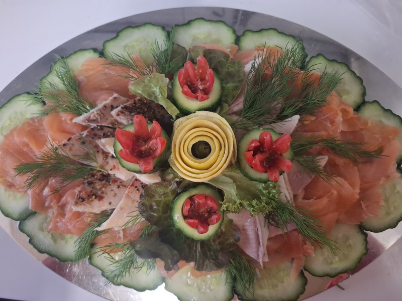 Schinken und Mettwurstplatte , geräucherter Lachs mit Sahnemeerrettich ,