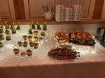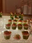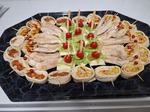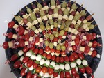 Kleine verschiedene Frischkäse Häppchen garniert , Räucherlachs mit Frischkäse im Gläschen , Tomate - Mozzarella Spieße , Räucherlachstaler , kleine Hackbällchen am Spieß , kleine Hähnchen Kebabs , Gemüsesticks mit Dip , Schweinemedaillons garniert kleine Tomaten mit Reissalat gefüllt , Pastasalat im Glas , Käsespieße und Früchte im Glas